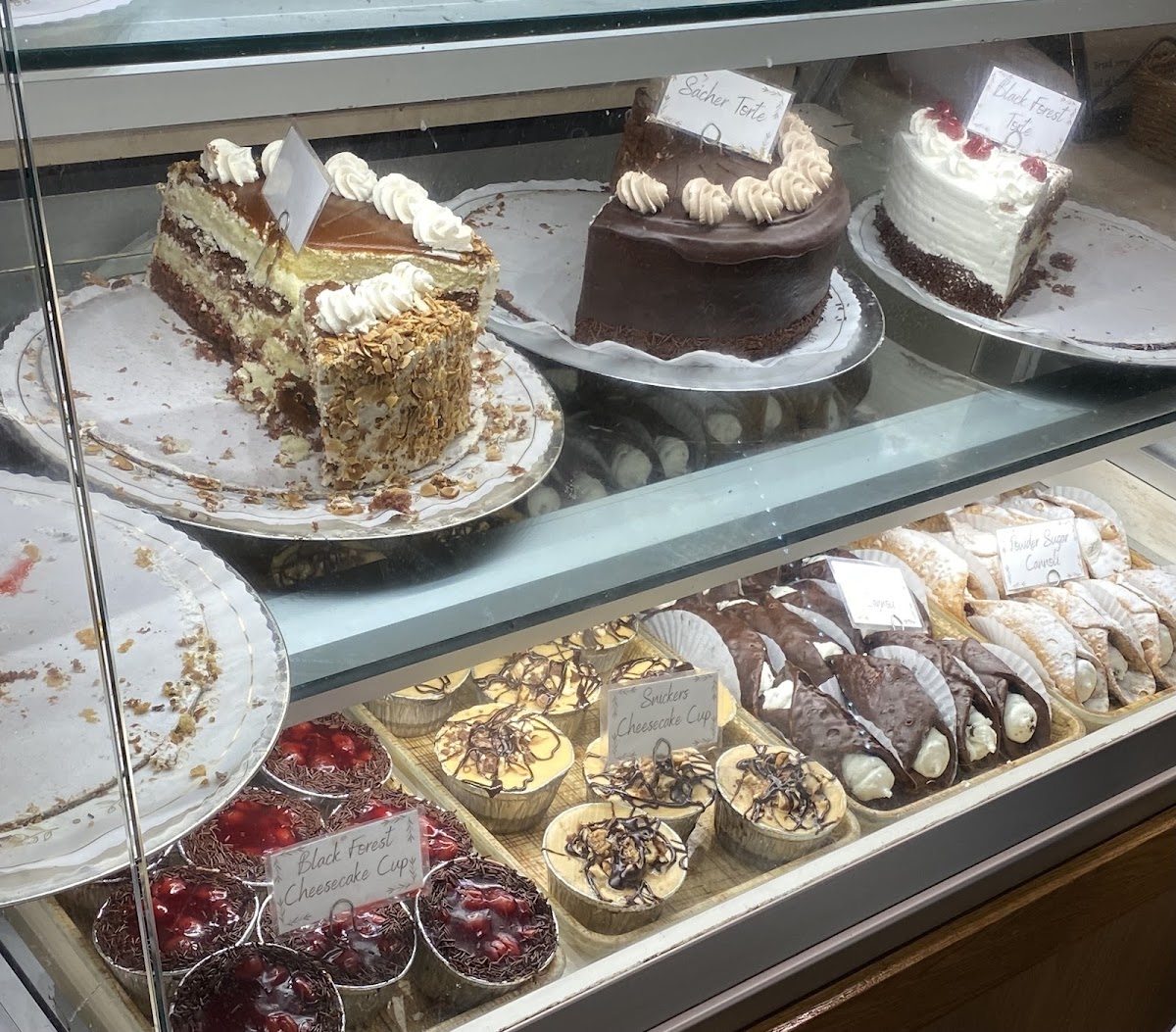 We stopped here before we left Helen. Sadly, it's closed Tuesday and Wednesdays, which is when we were there. We only bought stuff from the bakery. I got: -3 twists- 2 cinnamon sugar and 1 glazed. They were okay. Taste like bread- not sweet. They didn't have great flavor. -3 cranberry muffins- they were good, flavorful and moist. I think it would be better with orange and more cranberries. -3 chocolate croissants. These were amazing! They had a lot of chocolate and were flaky. I wish I got more. -1 piece of hazelnut torte- It was okay. Chocolate cake was dry and the jelly overpowered other flavors. -2 Linzer tart cookies- These were okay. There was not enough jelly and the cookie was too soft for my liking. The bill came out to be almost $100! There is no price list, but I thought it was a little much especially because that means each thing averaged about $8. Most items were not worth that. I do want to go back and get more chocolate croissants! It was busy, but everyone we helpful and nice!